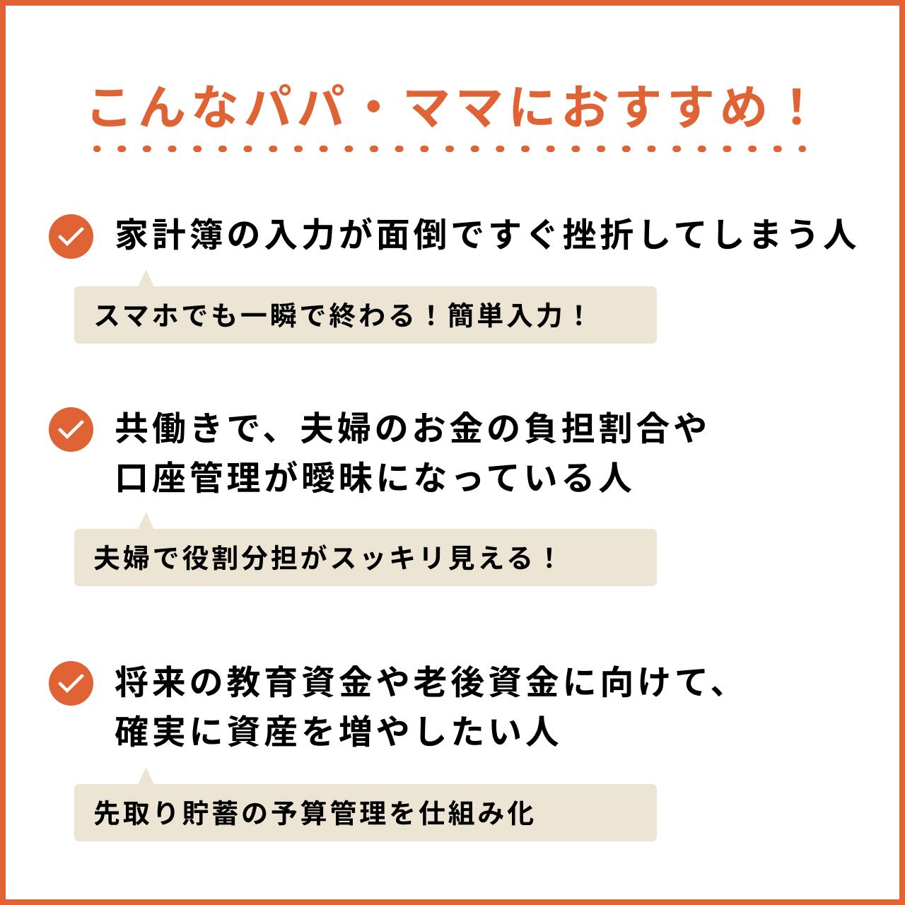 ▷ 将来の教育資金や老後資金に向けて、確実に資産を増やしたい人(先取り貯蓄の予算管理を仕組み化して解決します)