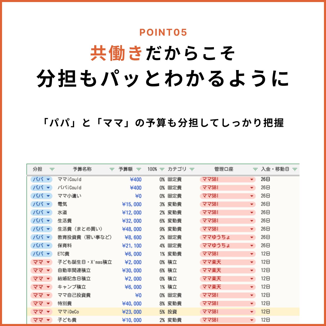 この新しい予算管理シートでは、「誰がどの予算を担当し、どの口座・どの支払い方法(クレジットカードやポイントなど)を使うか」まで明確に定義できます。